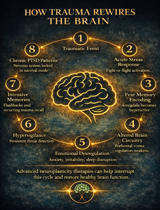 This illustration helps to show how unresolved trauma progresses from the initial traumatic event to long-term changes in brain circuitry and emotional regulation.