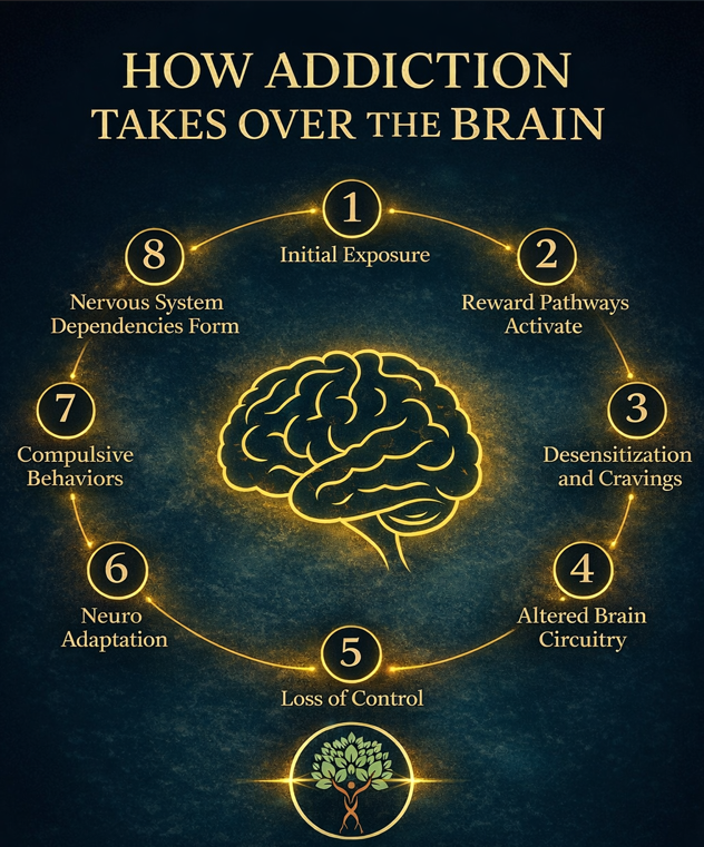 Understanding the cycle of addiction is the first step toward interrupting it. This illustration shows how substance use progresses—from Initial Exposure to Formation of Nervous Systems Dependencies — as brain circuitry and reward pathways become progressively altered. ( In some cases like that of Benzodiazepines withdrawal seizures can be present if taper and conversions are not correctly administered or observed)